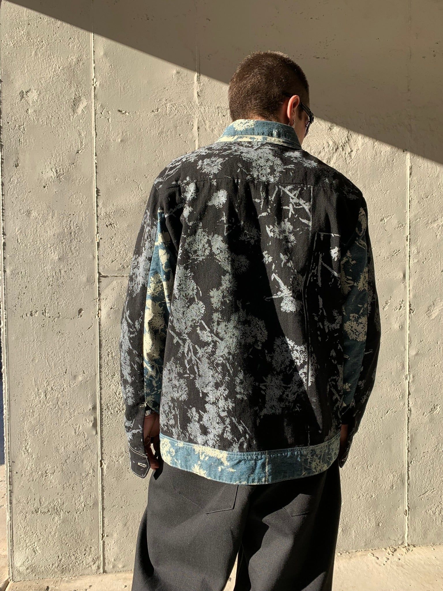 100% cotton denim with discharge printed pattern.