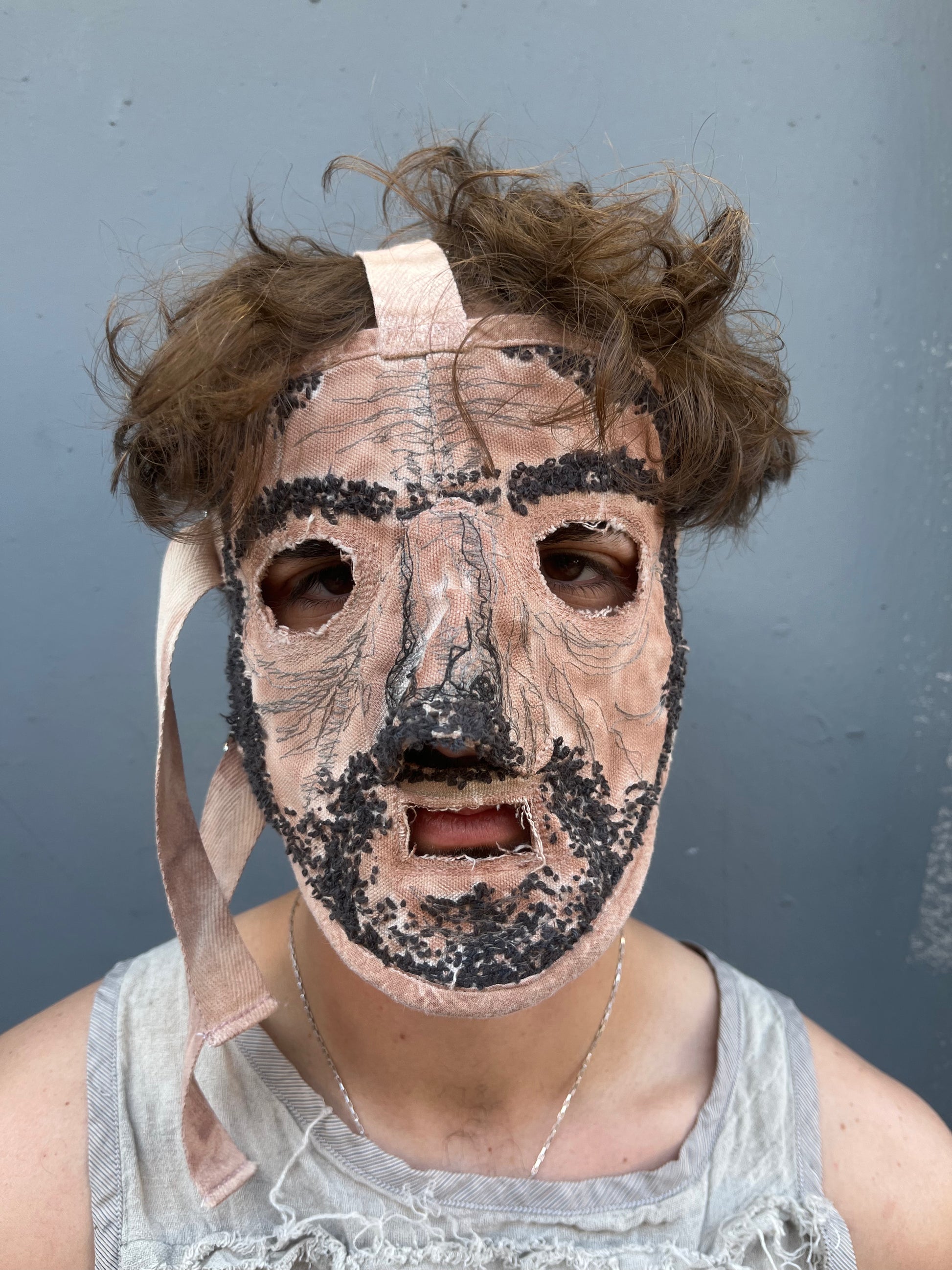 Cut and sewn full face mask with chainstitch, chenille, and darning embroidery