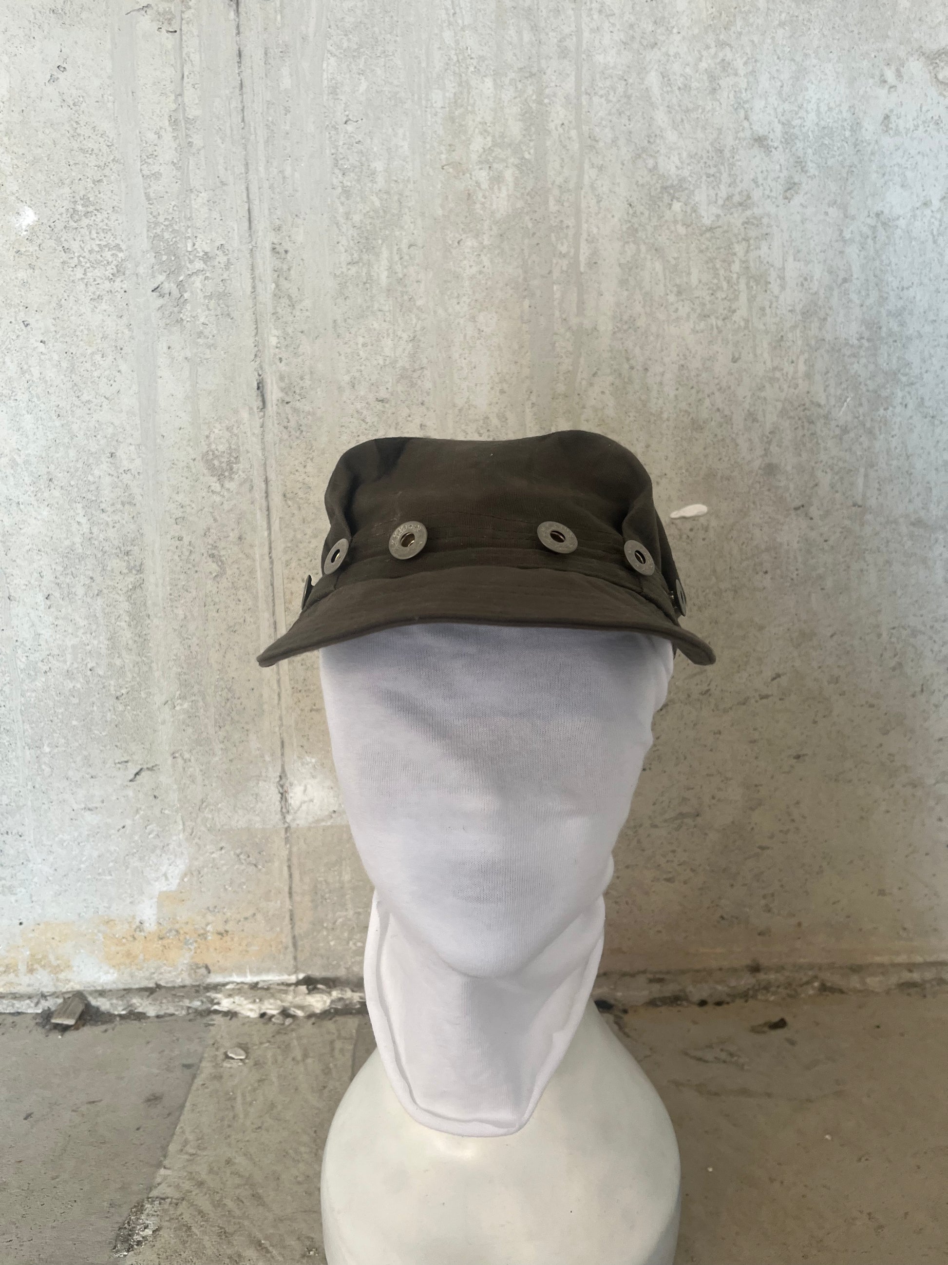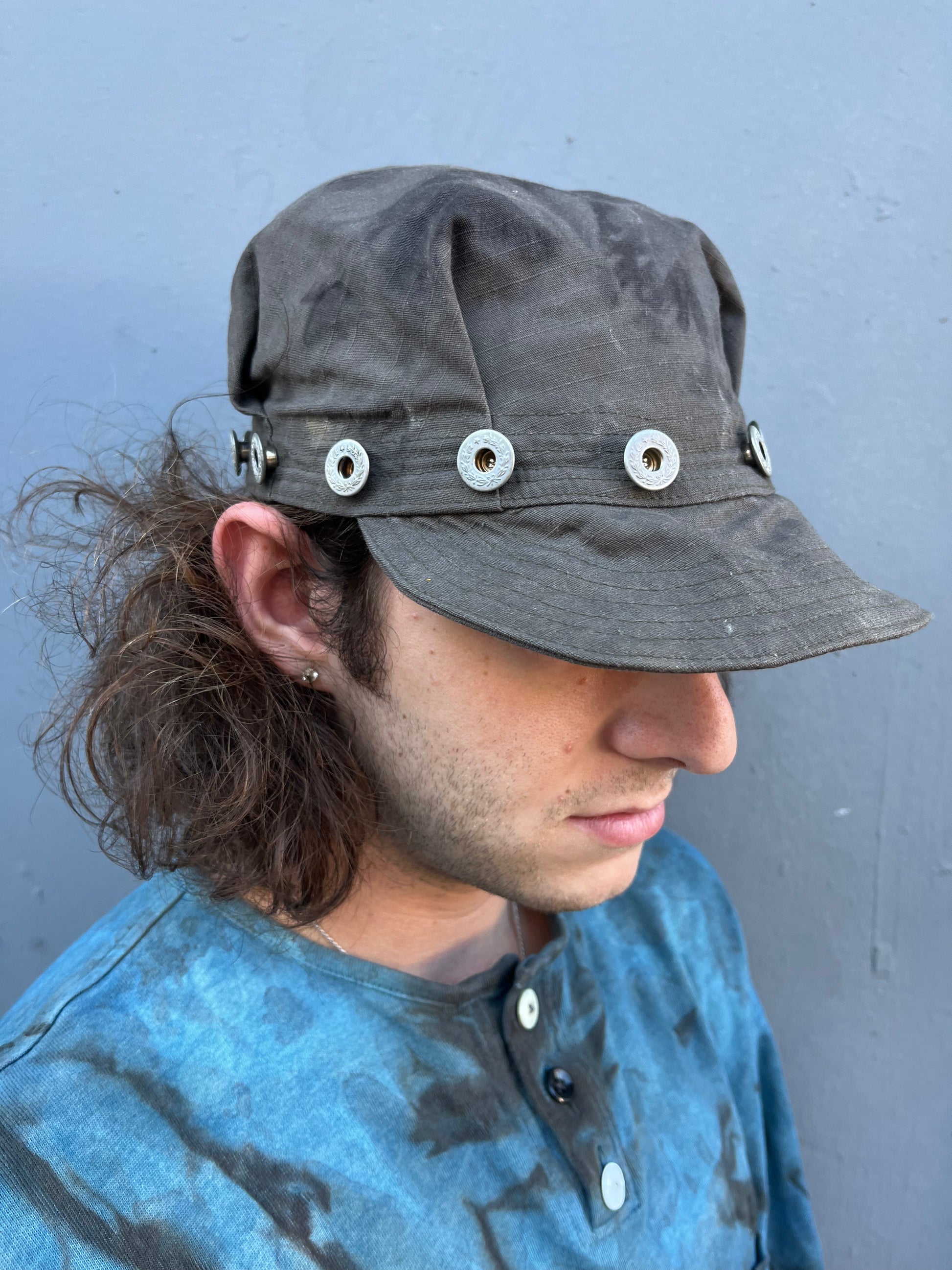 Pleated mechanics hat embellished with metal reproduction laurel wreath buttons.