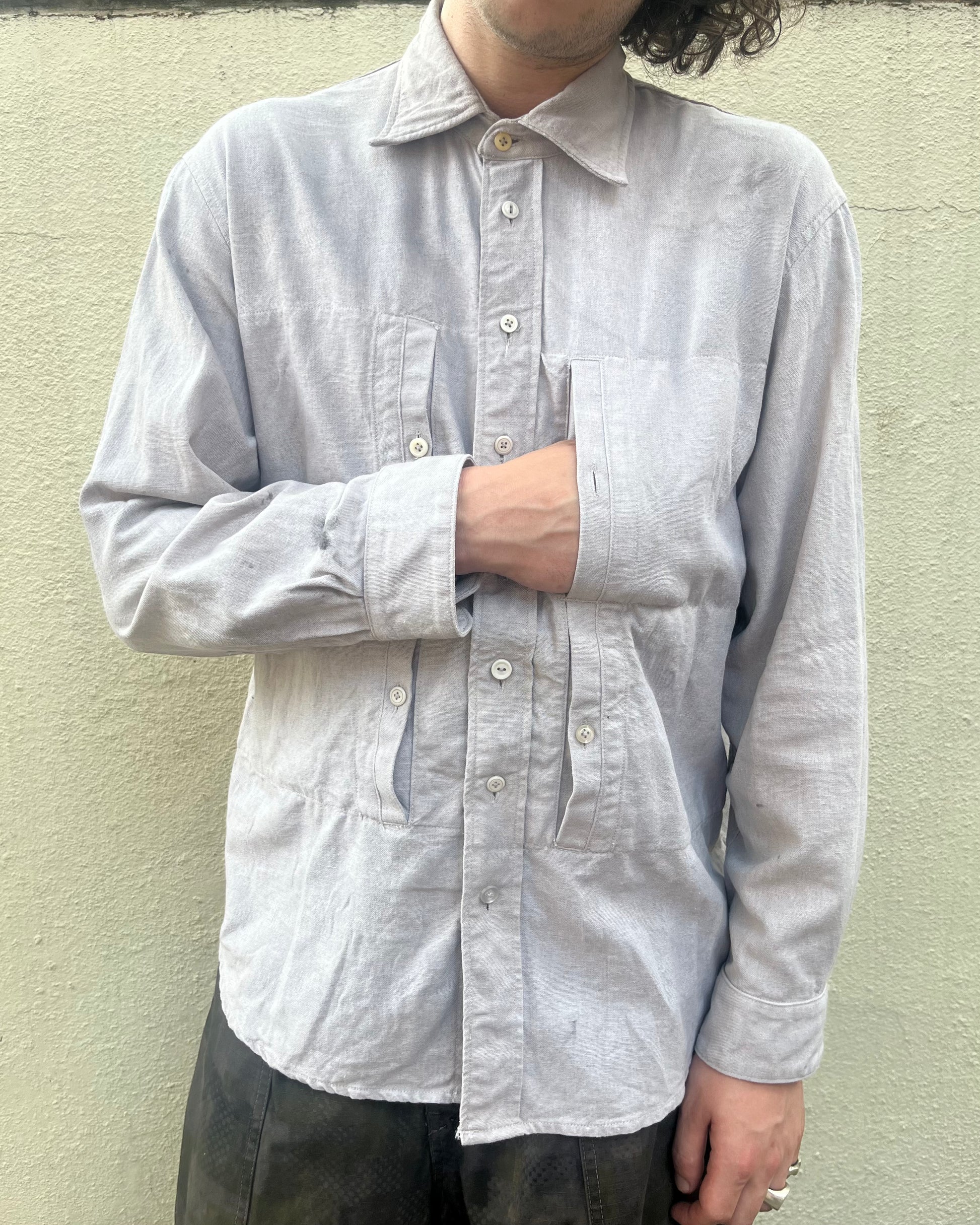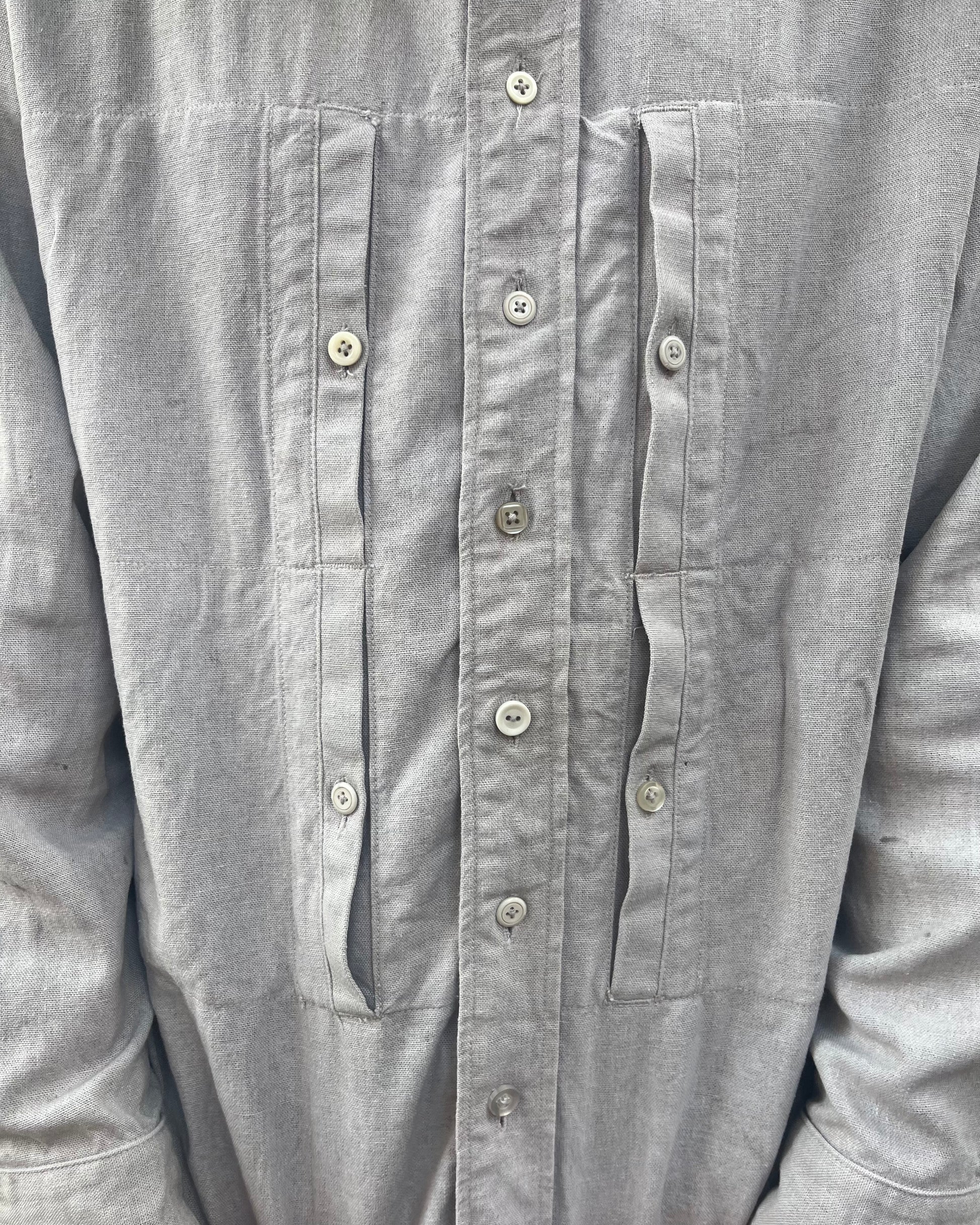 Workwear inspired button down shirt, featuring 4 wide welted pockets along the front chest. A roomier fit for mobility, and optional layering. The buttons used are reclaimed, although all similar in tone and color, each shirt is entirely unique. Constructed from a Linen/Cotton blend, this garment gets the cold and breathable properties of linen while being able to care for it the same as any of our cotton garments.