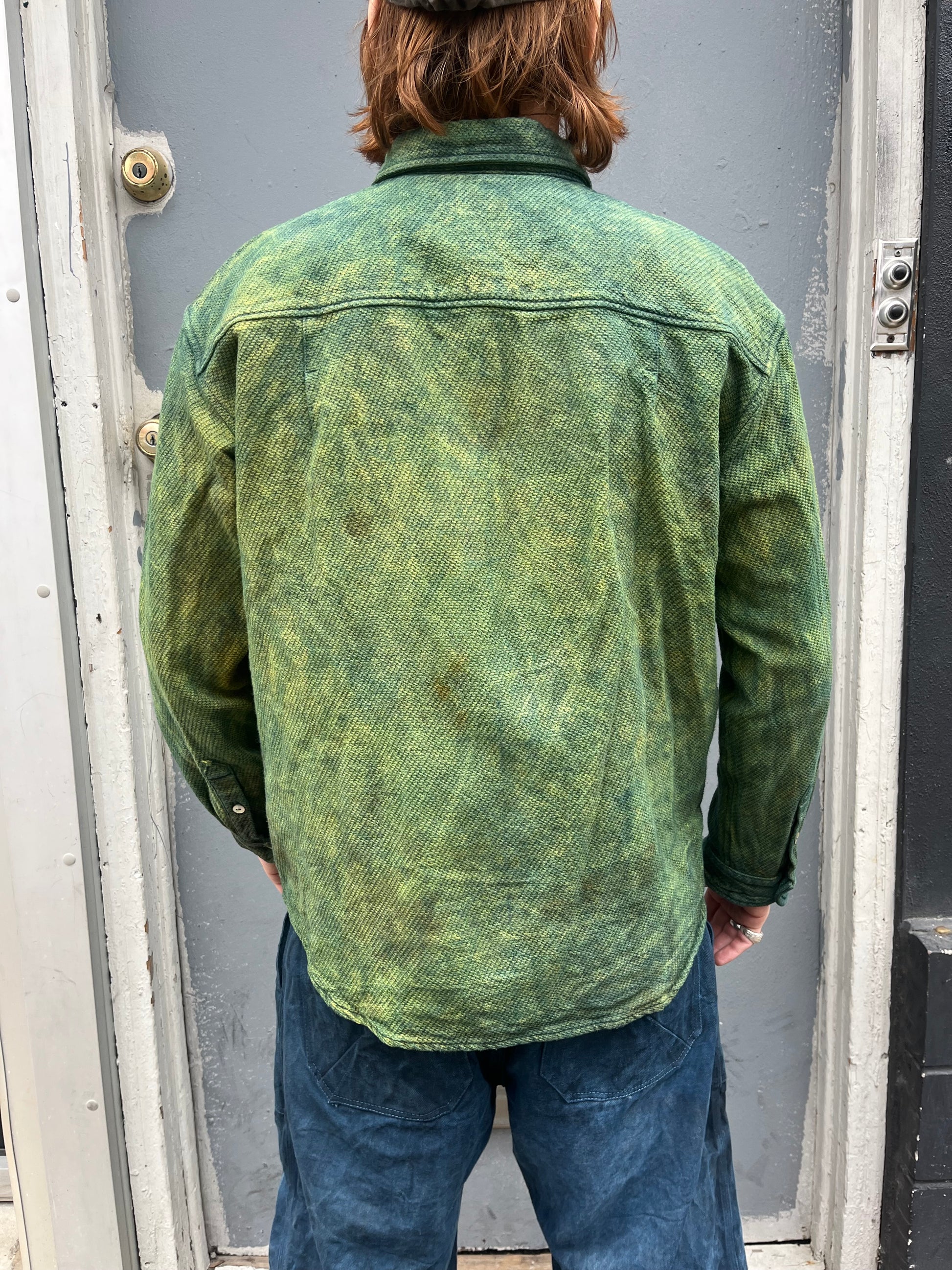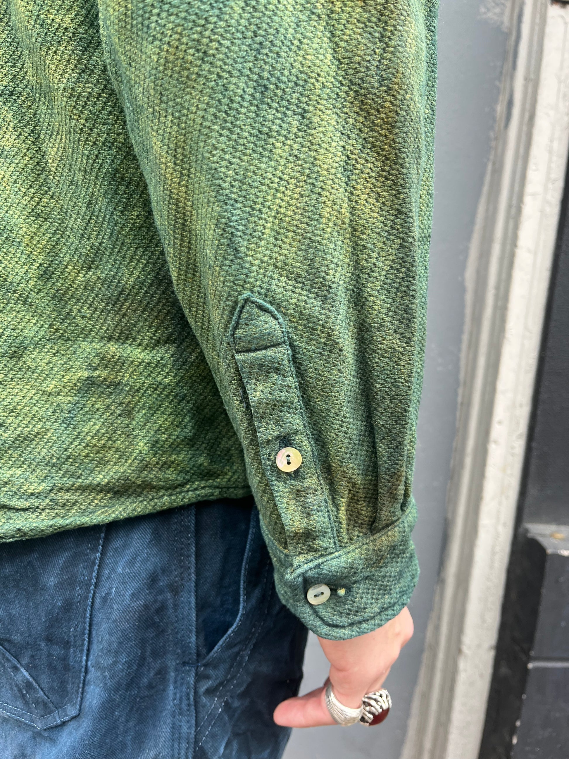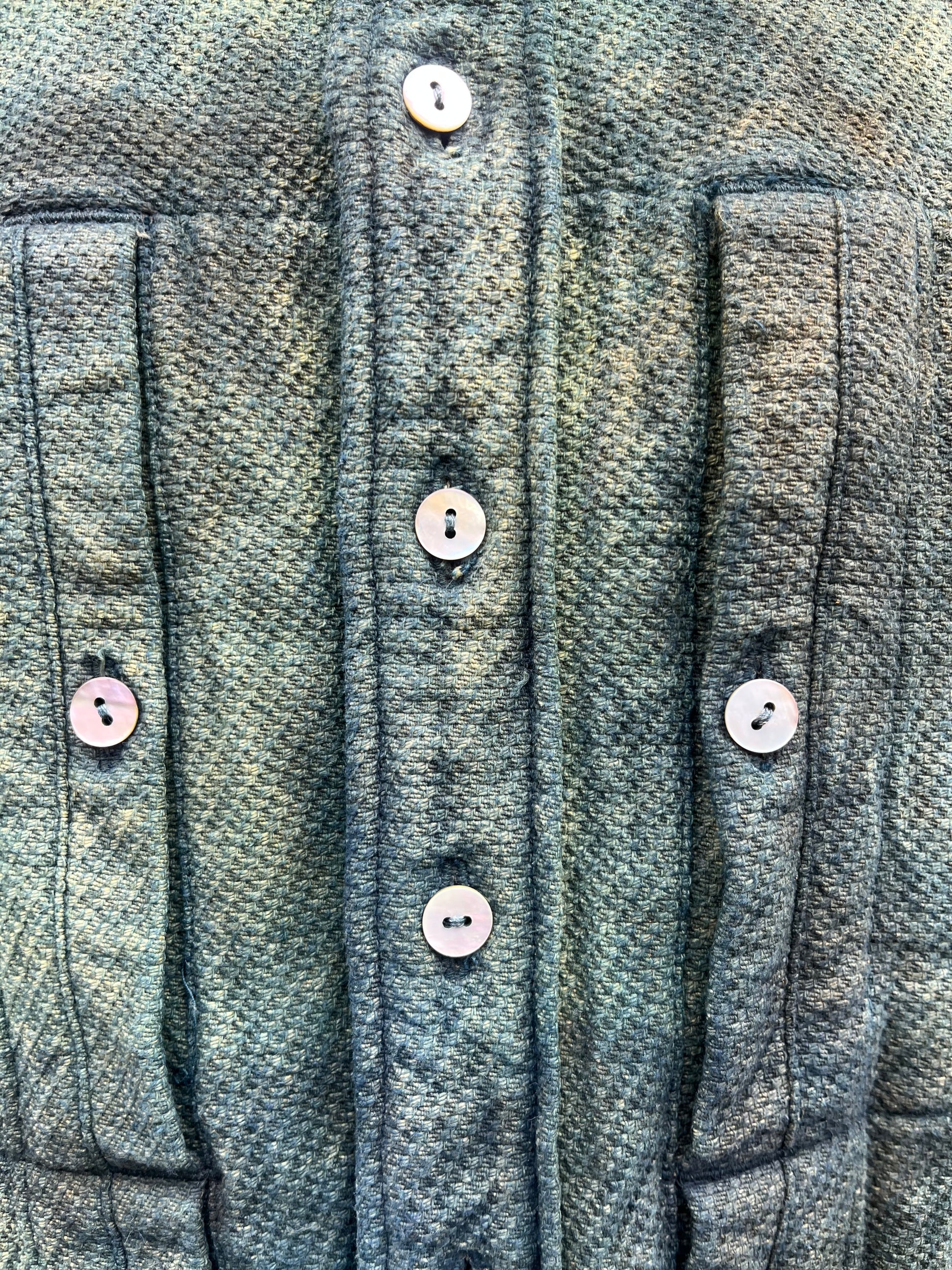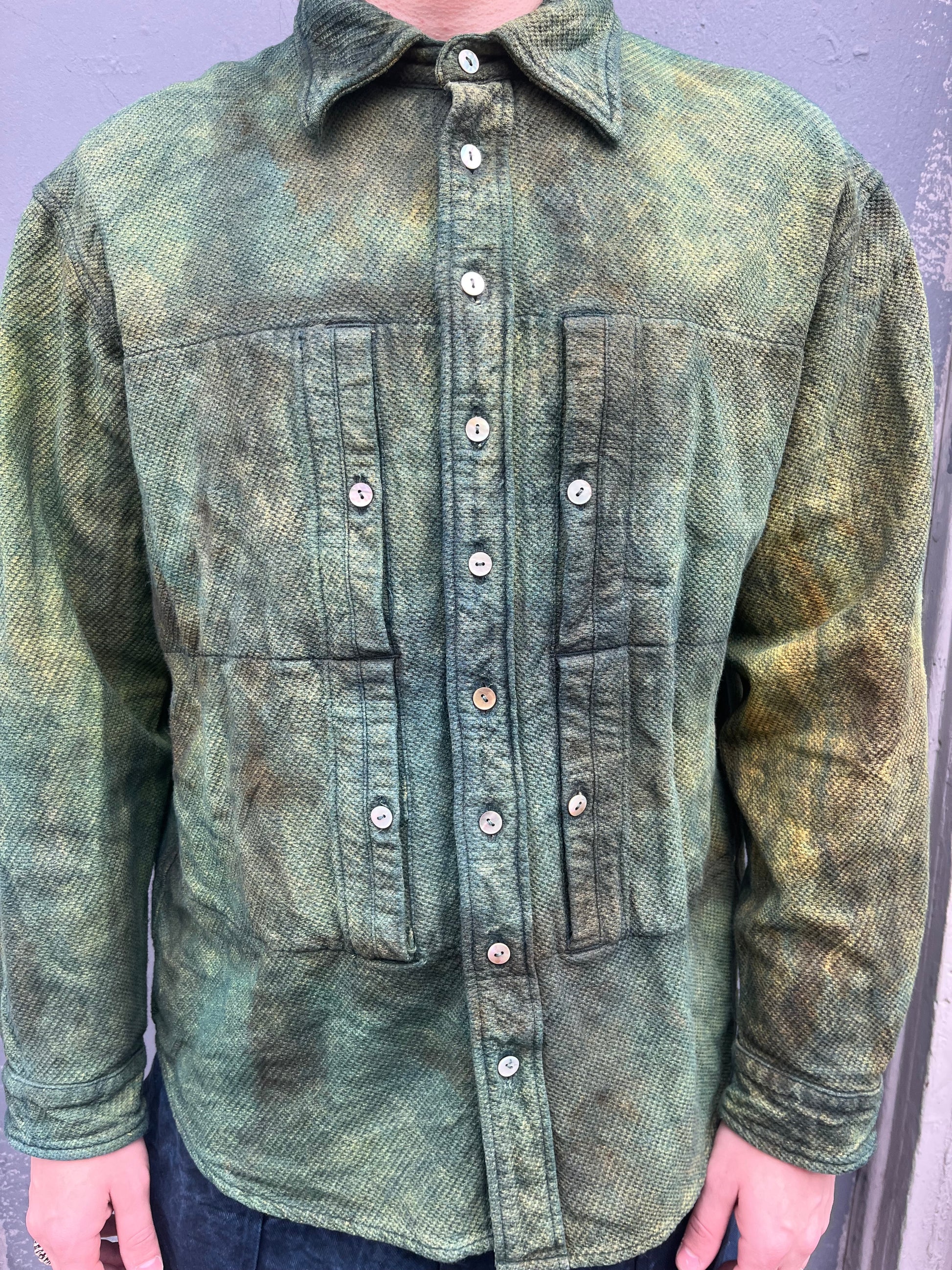 Workwear inspired button down shirt, featuring 4 wide welted pockets along the front chest, and shell buttons. A slightly more cropped, and boxy fit. The brushed canton weave offers a visually interesting face, which takes on our "green" indigo and turmeric dye, while offering a soft interior.