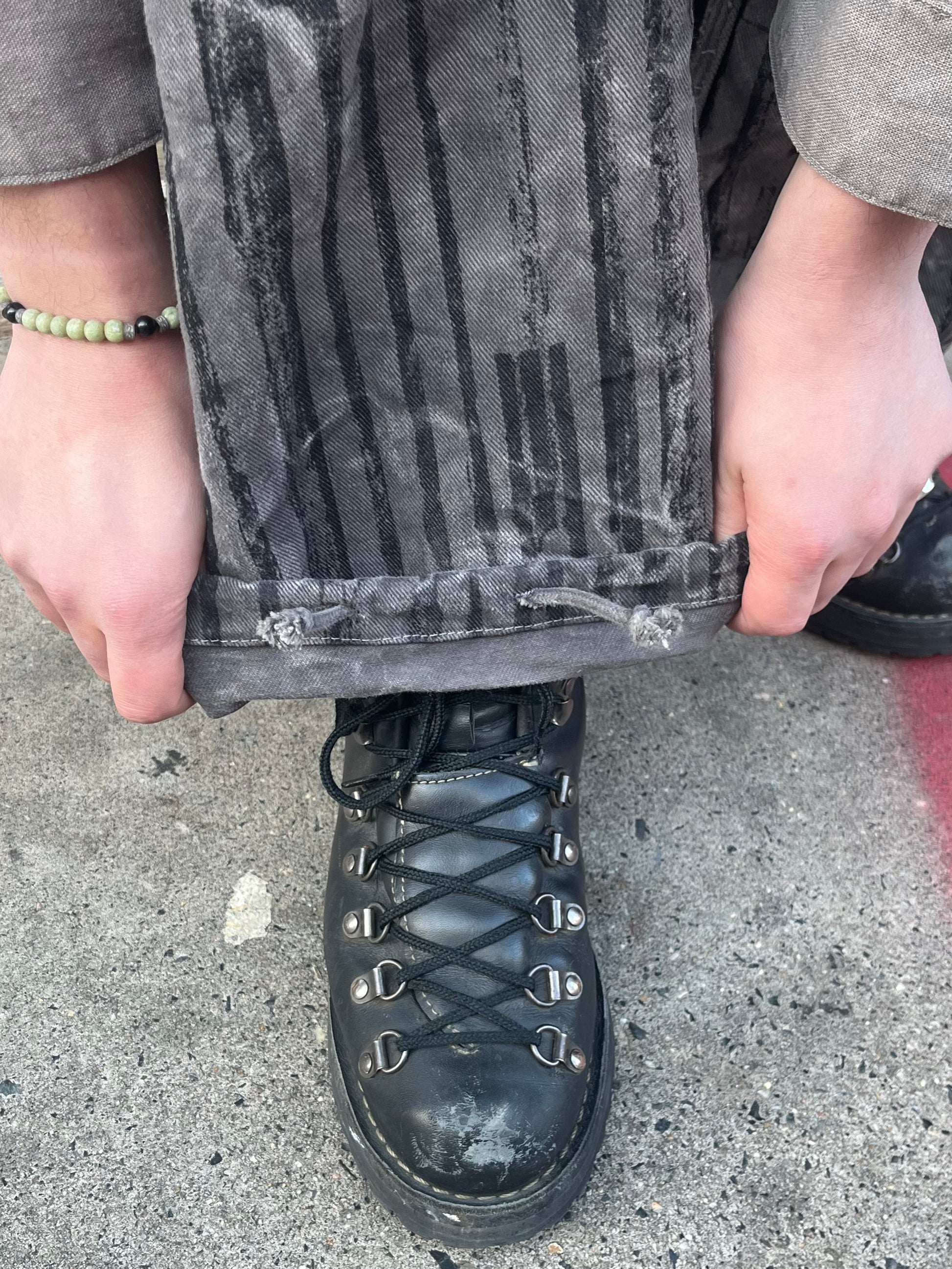 Utility Thwocket (thigh-welted pocket… sometimes we have a hard time coming up with names for things) Pants, made from 12 oz USA-made denim, with a stripe print done in house. Garment dyed with acorns and rust, giving them their purplish grey color.
