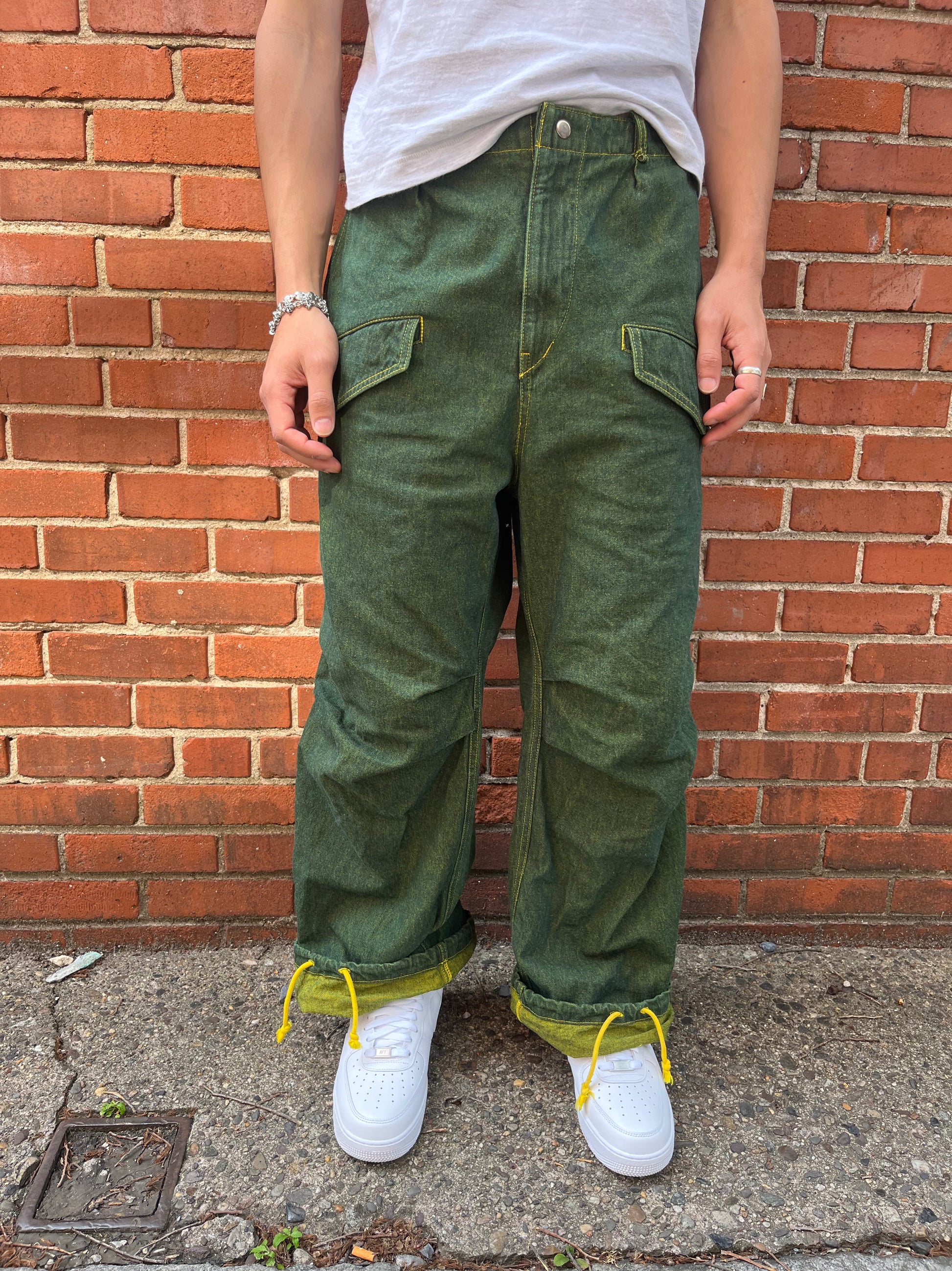 Utility Thwocket (thigh-welted pocket… sometimes we have a hard time coming up with names for things) Pants, made from 11 oz, USA-made, indigo denim. These pants were garment-dyed with turmeric, staining the weft threads yellow.