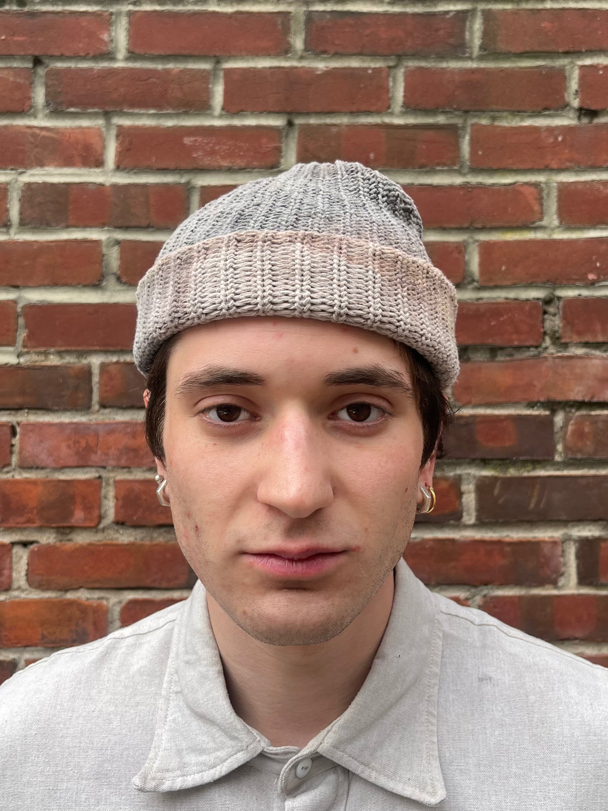 A wide gauge cotton knit, domestically produced watch cap. Over-dyed with Black Tea + Rust, with the corner dipped in a persimmon dye.